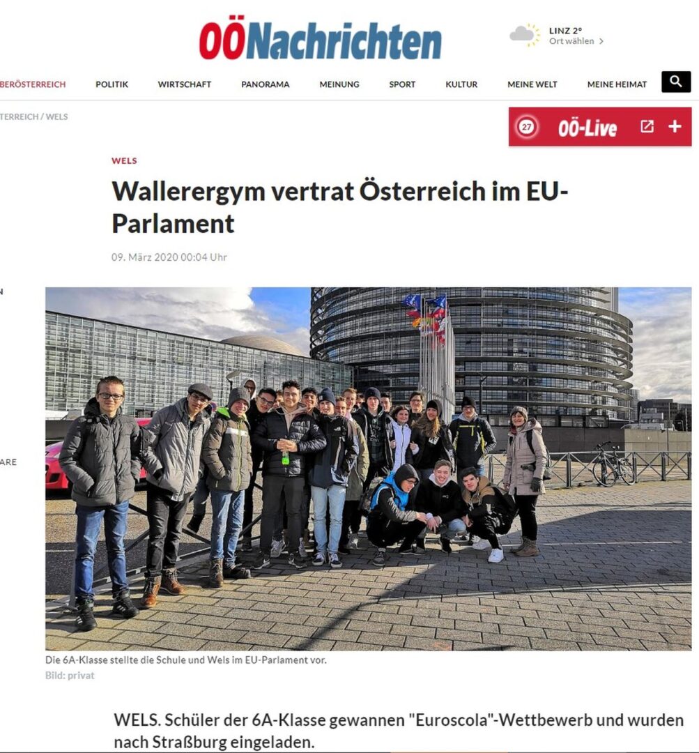 Als Sieger im „Euroscola“ – Wettbewerb wurde die 6A-Klasse als Österreichs Vertreter ins Europäische Parlament nach Straßburg entsandt – die Kosten dafür übernahm fast vollständig die EU.