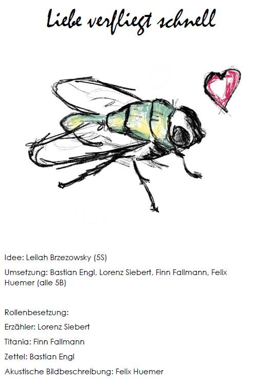Was wäre passiert, wenn Titania (aus Shakespeare’s Sommernachtstraum) keinen Esel sondern eine Fliege vor sich gehabt hätte, nachdem sie aufgewacht war? Diese ebenso überraschende wie interessante Idee einer Schülerin der 5S setzten ihre Kolleginnen und Kollegen aus 5S und 5B in Mini-Dramen um. Herausgekommen sind äußerst vielfältige und amüsante Varianten einer absurden, aber dramaturgisch unausweichlichen Liebesbeziehung. Bei den Leseproben im Distance-Learning stellte sich auf Anhieb „Liebe verfliegt schnell“ von vier Schülern der 5B als akustisch aufführungsreif heraus. Wir wünschen viel Vergnügen beim Anhören!