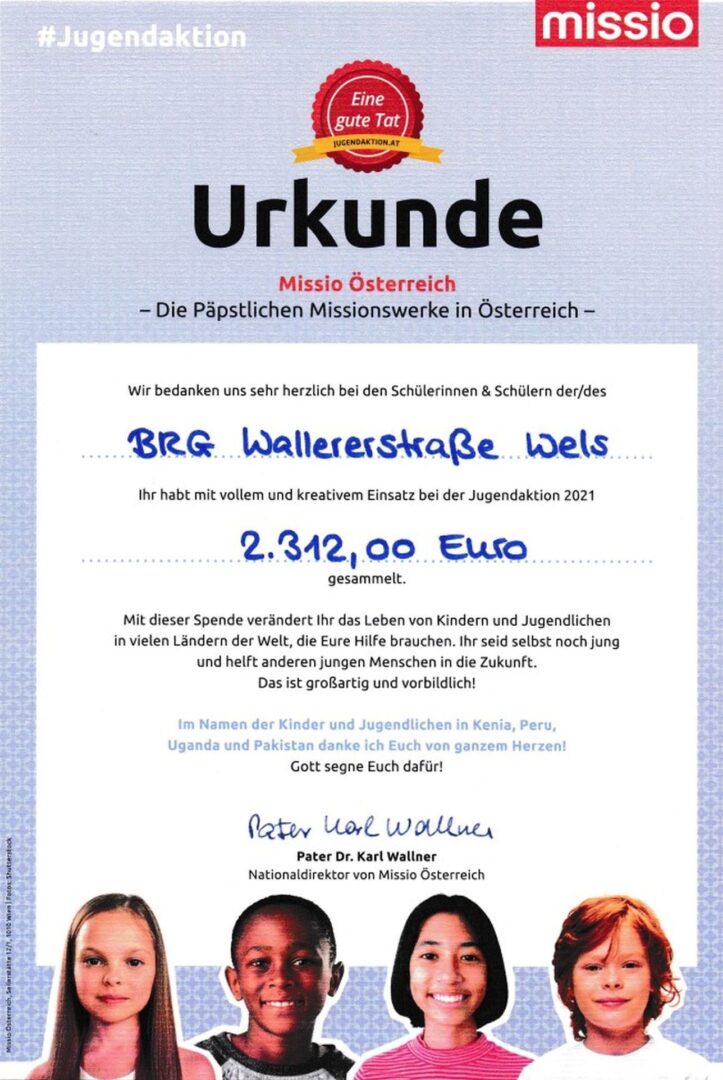 Im Zuge des Missio Projekts im Herbst haben Schülerinnen und Schüler unserer Schule Pralinen verkauft und so eine stolze Summe von 2 312 Euro für Kinder und Jugendliche in Kenia, Peru, Pakistan und Uganda gesammelt. Dafür gab’s jetzt eine Urkunde.