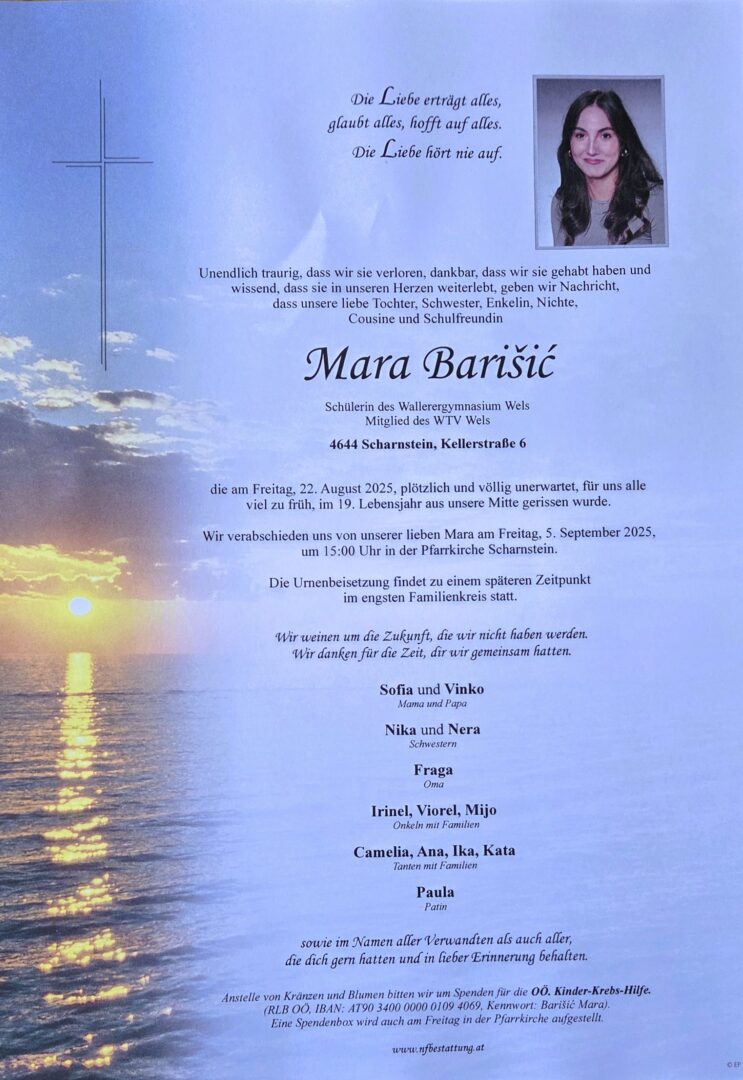 Mit großer Bestürzung und tiefer Trauer müssen wir mitteilen, dass unsere Schülerin Mara Barišić aus der Klasse 8S verstorben ist.